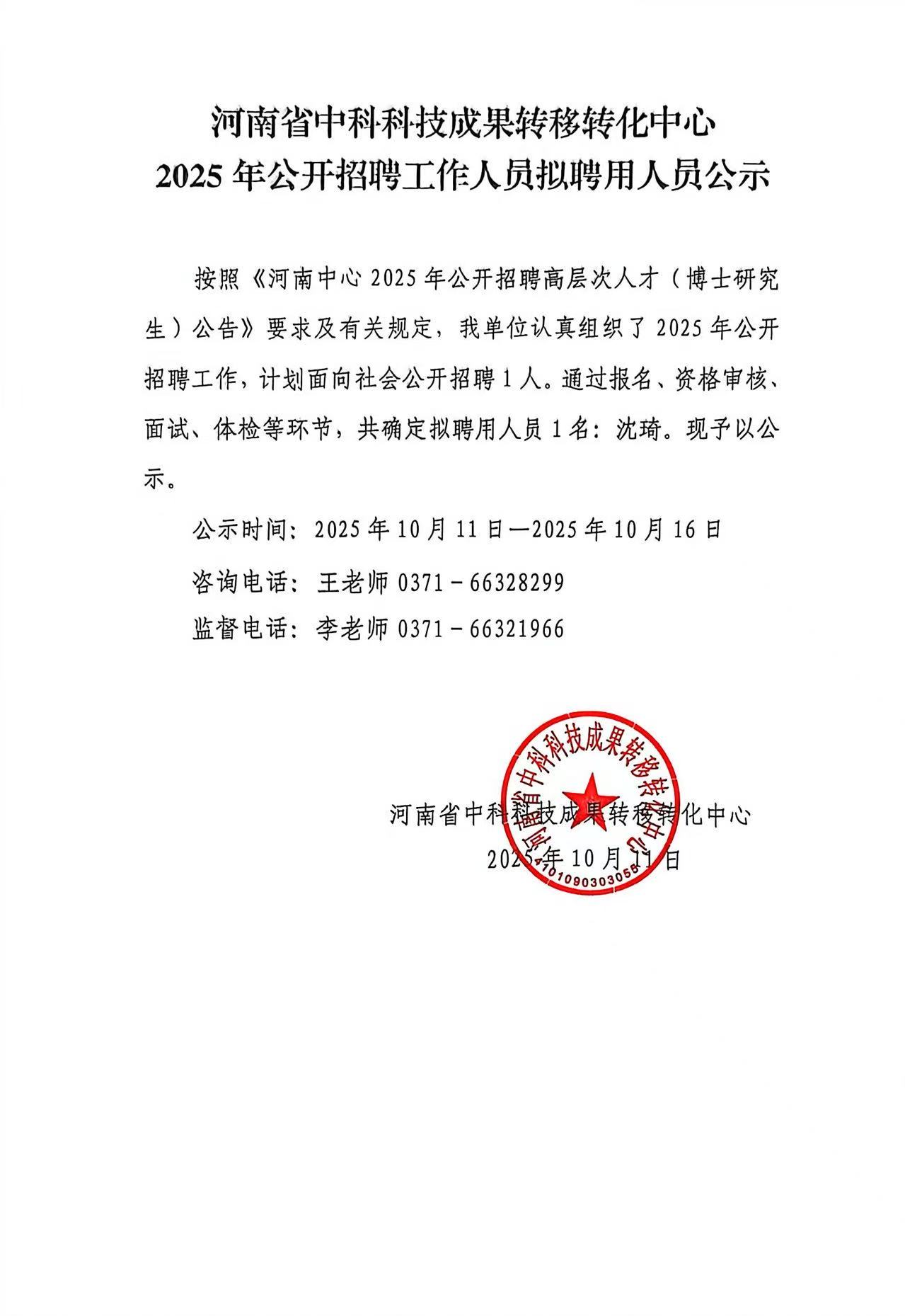 河南省中科科技成果转移转化中心2025年公开招聘工作人员拟聘用人员公示
